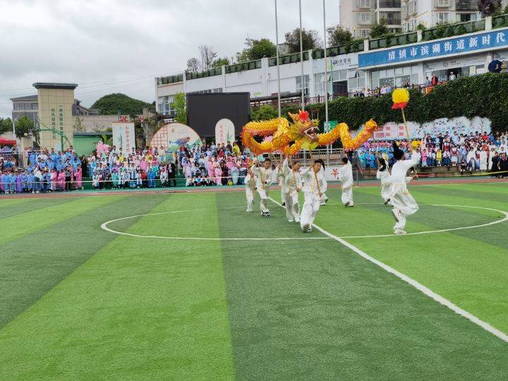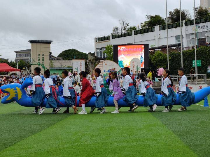 当“六一”遇上“端午”,舞巨龙、赛龙舟必不可少。5 月 26 日上午,红枫三小体育场上掌声雷鸣,踩着“咚咚锵,咚咚锵……”的欢快鼓点,一条色彩艳丽的“巨龙”开始在校园里蜿蜒翻腾,不时赢得师生的阵阵欢呼与掌声。这是该校为学生量身定制的课后服务特色课程——龙腾校园。舞龙表演刚刚结束,“赛龙舟”活动就迫不及待登场。没水怎么赛龙舟?师生有的是办法——在陆地上骑着充气龙舟赛跑就是了。旱地“赛龙舟”,考验的是队员的配合以及协调能力。比赛过程中,有的队伍口令一致,步伐稳健,快速到达;有的队伍速度过快,失去重心,集体摔跤;还有的队伍节奏混乱,步履维艰。赛场上笑声、掌声不断。在蹴鞠赛场,16 名身着古装的学生为大家表演了蹴鞠运动方式与技法,以直观、生动、形象的场景加深了学生对蹴鞠运动的认知,仿佛让人回到800年前那个全民蹴鞠的时代。