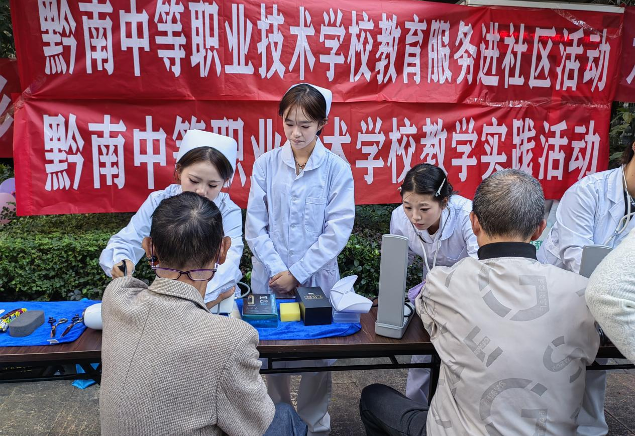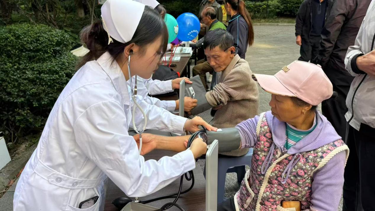 康养专业的同学们更是将课堂所学应用于实践,利用专业设备认真为每一位前来参加活动的老人测量血压,并耐心解答老人们关于健康保养、日常饮食等方面的疑问,普及基础健康知识,体现了专业的素养和对长者健康的深切关注。
