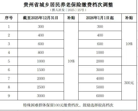 贵州省城乡居民养老保险缴费档次调整
