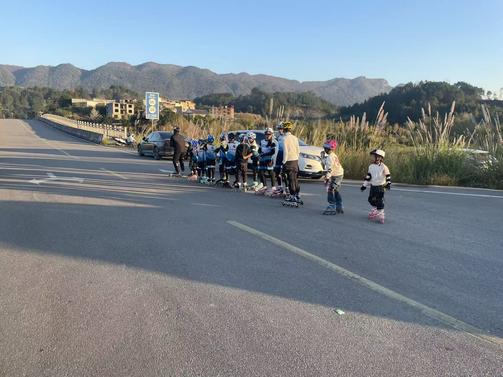 轮滑小队的山野日落局[emoji] 公路上列队的小身影,是风也追不上的少年气✨ 月亮雕塑下的合影,把今天的快乐都封存在晚风里[emoji]