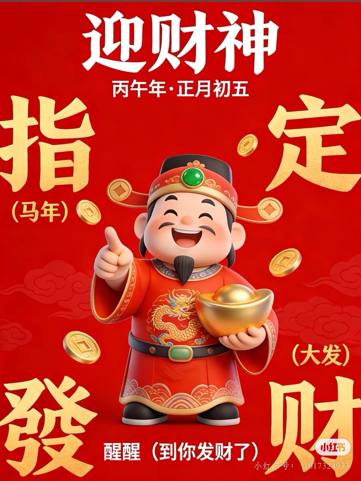大年初五,财神驾到。 许个心愿,鸿运当头。 愿我们健康又有颜,兜里常有花不完的钱。 财来,钱来,钱从四面八方来²⁰²⁶。